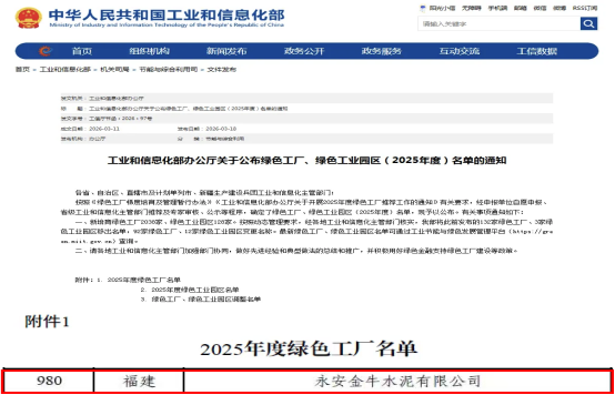 近日,国家工信部“2025年度绿色工厂名单”发布,福建金牛水泥(集团)下属子公司永安金牛继将乐金牛之后,成功入选国家级“绿色工厂...